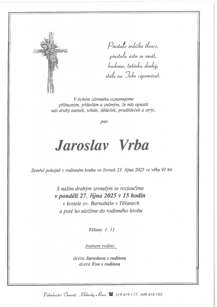 Smuteční oznámení - pan Jaroslav Vrba