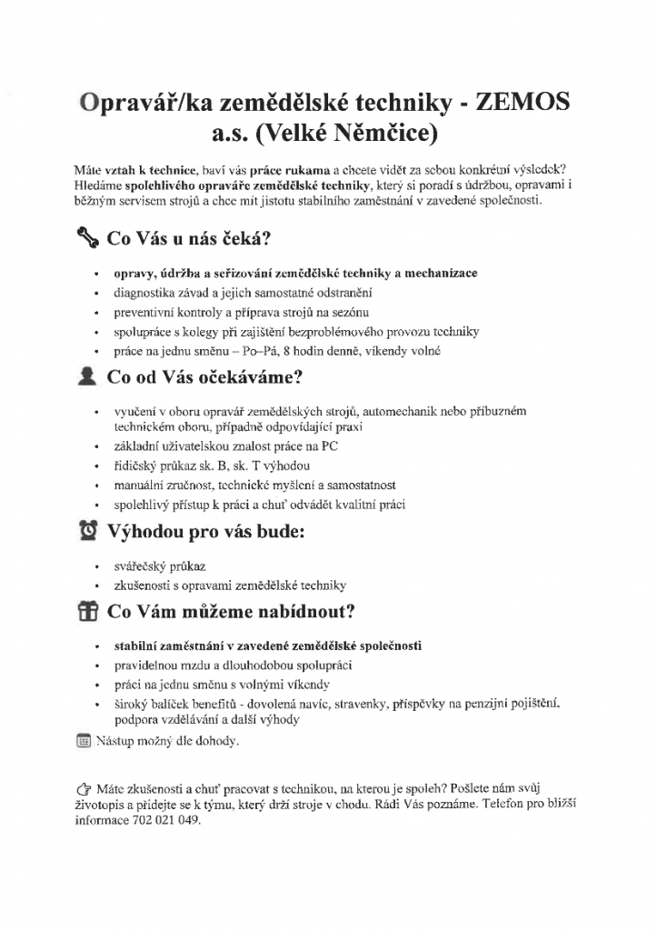 Opravář- ZEMOS Velké Němčice